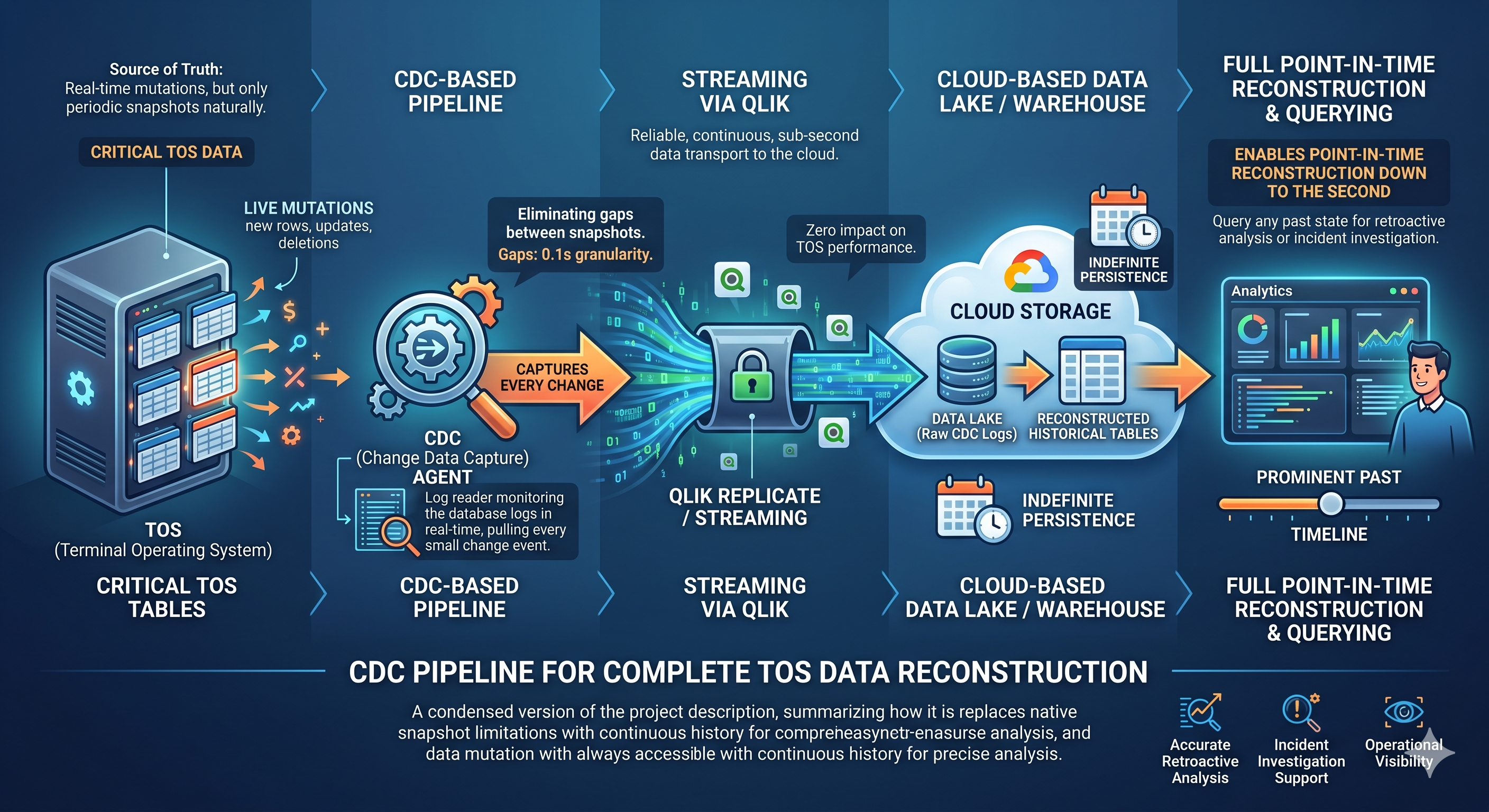 A CDC-based pipeline capturing every live mutation to critical TOS tables and streaming them to the cloud via Qlik — enabling full point-in-time reconstruction of any table’s state, down to the minute. The TOS’s only native option was periodic snapshots, leaving large gaps whenever retroactive analysis or incident investigation required knowing exactly what the data looked like during a specific operation.